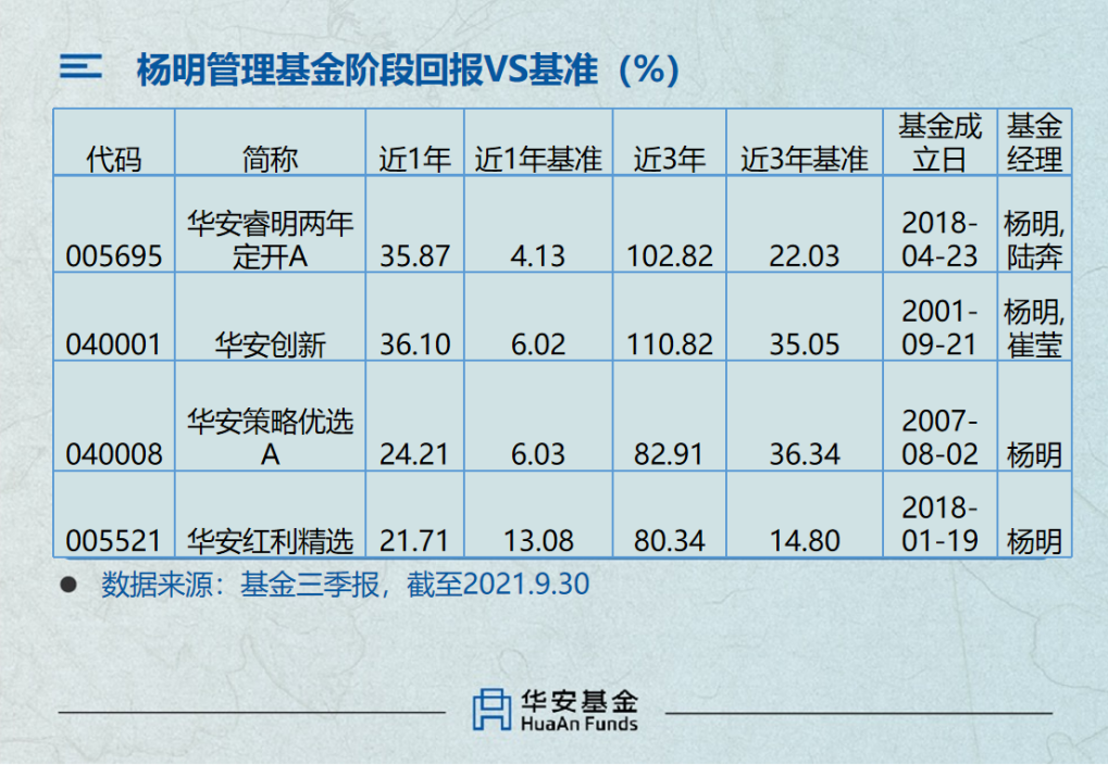 根据基金年报、季报数据,截至2021年9月30日,杨明目前管理基金业绩如下: