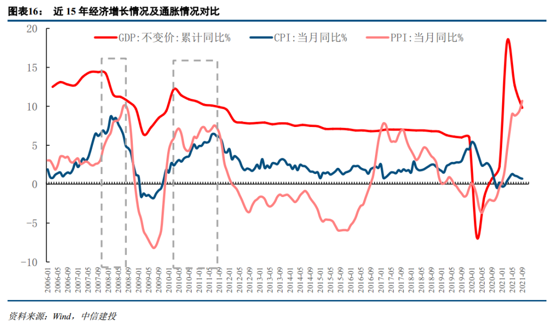 在中国经济全球率先复苏之后,自2021年一季度开始,GDP同比增速逐步回落,增速略低于市场预期。在石油输入通胀、煤炭进口受限等原因导致能源供给不足,工业品价格大幅上涨,PPI达到了叠加猪价企稳反弹,CPI亦有明显上行,经济呈现出一定类滞胀的特征。