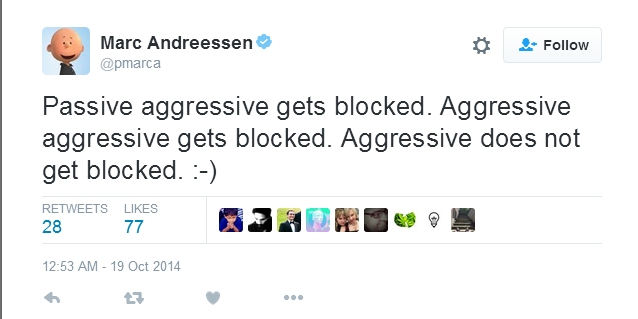 据不完全统计,到2015年年底,已经有201个账号被Marc拉黑,超过1700条推文包含了#被@pmarca拉黑#或#被安德森拉黑#的话题。被拉黑的人群,并不具有明显共同特点,有科技记者,有投资人,有创业者,有企业家,有微软的员工,还有资料模糊并且不活跃的在国内俗称僵尸粉的用户。显然Marc对于拉黑这件事不存在任何偏见。