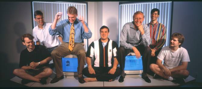 (图片俩坐电脑上的分别是Marc(左)和Clark(右),其他的都是跟着Marc从NCSA出走的Netscape的团队成员)