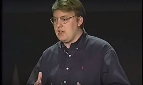 (1996年10月16日网景在纽约举行的第二次互联网大会,25岁仍显青涩的有头发的Marc,在演讲台上侃侃而谈网景的经营策略)