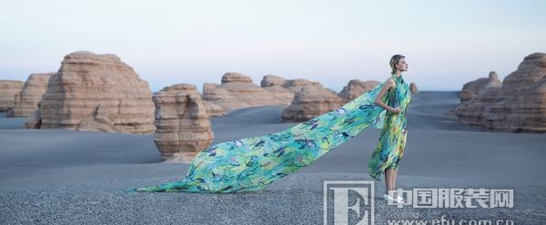 团队在对一些植物染料和印染工艺的挖掘上也做了很多尝试,今年春夏我们有一个系列用到了雨滴冷染的工艺,设计小组走到江苏非常专业的工厂里蹲点了一个多星期和工艺师一起反复试验,研究面料的成分和肌理,水和染料的比例,以及后期用鹅暖石滚磨脱色的程度,最终才做出了非常漂亮的中国历史诗文里所讲的“天水碧色“,这些对于面料纺织工艺和色彩表现以及工艺呈现上的创新,也是在强化我们的原创性。