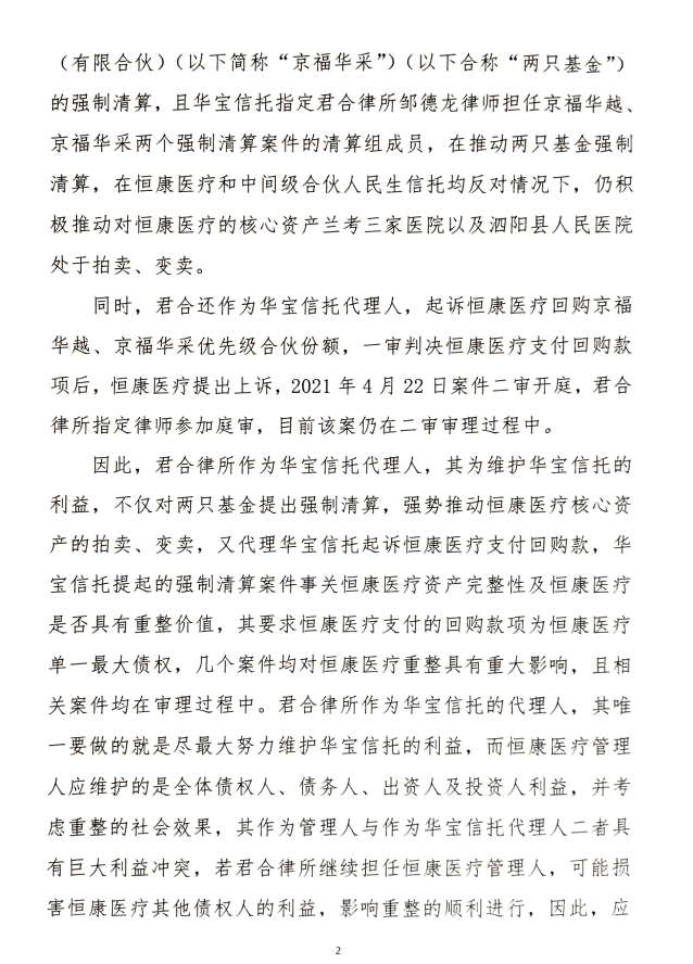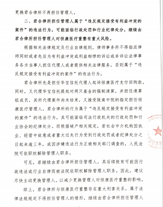 五矿金通目前所持有的*ST恒康原实控人阙文斌委托的上市公司12.59%的表决权,据了解其同时也是新里程牵头的*ST恒康破产重整联合投资人中的一员,而其所称的“重大利害关系”即君合律所作为华宝信托的代理人,已在2020年提起对*ST恒康旗下两只并购基金京福华越与京福华采的强制清算,君合律所方律师同时担任两只并购基金强制清算案件的清算组成员推动两只并购基金强制清算;君合律所还作为华宝信托代理人并起诉*ST恒康回购两只并购基金的优先级份额,其又多个与上市公司相关的案件在审。“君合律所作为华宝信托代理人,其唯一要做的就是尽最大努力维护华宝信托的利益,而恒康医疗管理人应维护的是全体债权人、债务人、出资人和投资人的利益”,二者之间“存在巨大的利益冲突”。