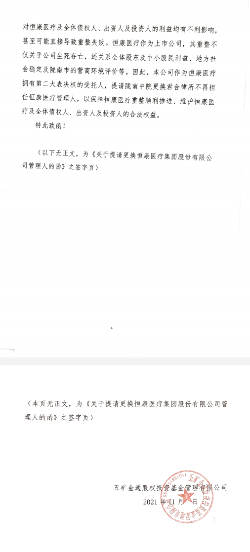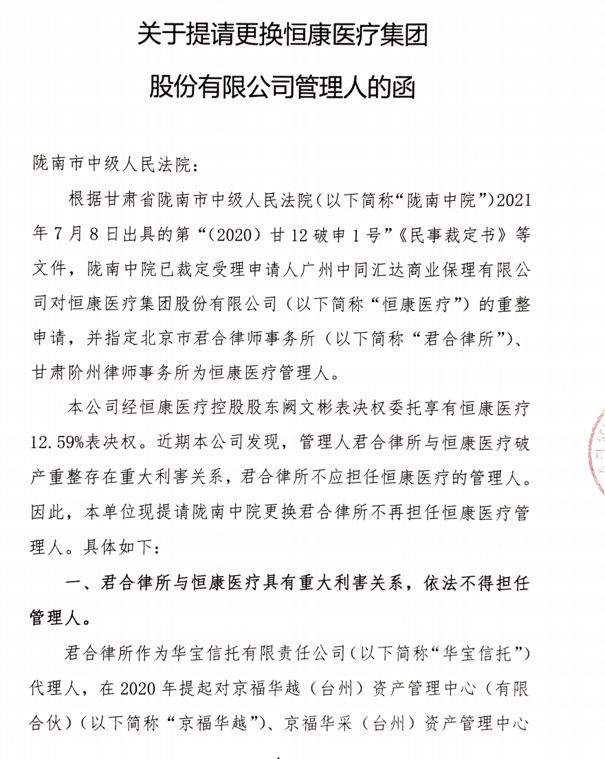 界面新闻11月16日独家获悉,作为*ST恒康实际上的第二大股东、同时也是*ST恒康破产重整联合投资人的五矿金通股权投资基金管理有限公司(以下简称“五矿金通”)已向甘肃省陇南市中级人民法院发出《关于提请更换恒康医疗股份有限公司管理人的函》,认为目前法院指定的两位*ST恒康破产重整管理人之一的北京市君合律师事务所(以下简称“君合律所”)“与*ST恒康破产重整存在重大利害关系”。君合律所不应担任管理人,提请进行更换。