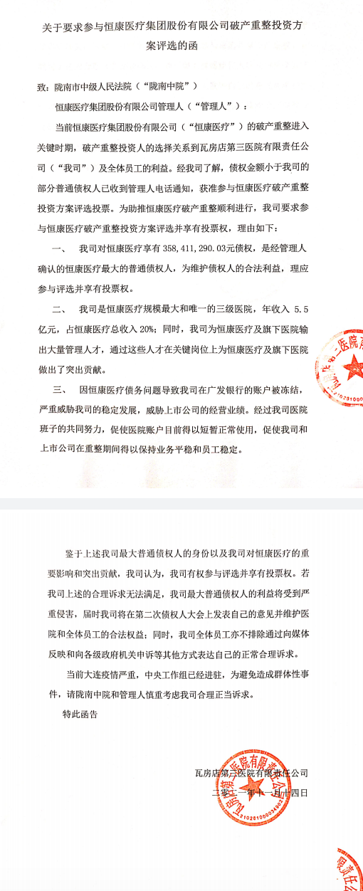 根据界面新闻获取的一份瓦房店第三医院责任有限公司(以下简称“瓦房店第三医院”)署名的《关于要求参与恒康医疗集团股份有限公司破产重整投资方案评选的函》,函中称“瓦房店第三医院是经管理人确认的恒康医疗最大的债权人...为公司发展做出了突出贡献”,但却并未被邀请参加*ST恒康破产重整投资方案评选。