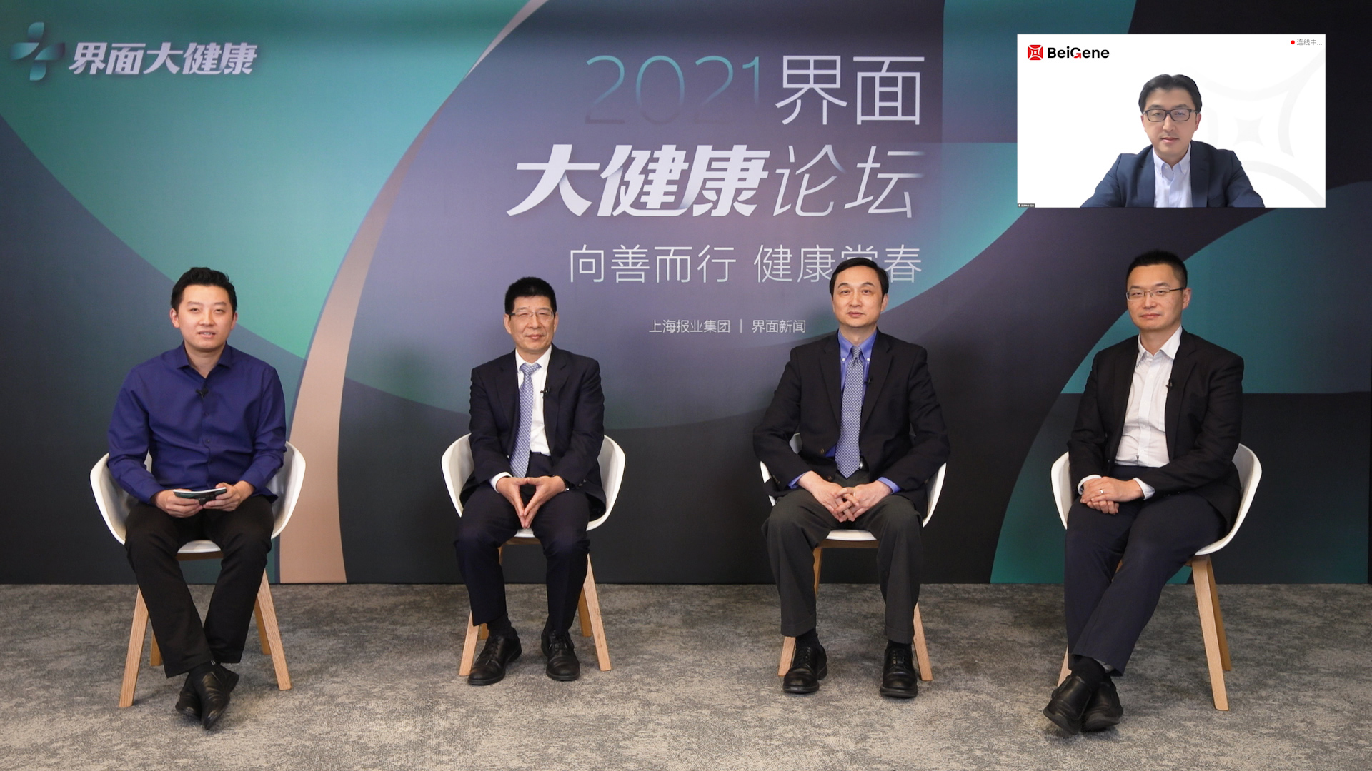 11月16日,由上海报业集团 | 界面新闻主办的2021【界面大健康论坛】在线如期举办。在圆桌对话“中国医药产业创新出海之路”中,界面新闻健康频道副总监谢欣担任主持,百济神州高级副总裁、全球研发负责人汪来博士,江苏恒瑞医药股份有限公司高级副总经理、全球研发总裁张连山博士,君实生物首席执行官李宁博士,兴业证券董事总经理、研究院副院长、医药行业首席分析师徐佳熹博士作为此次圆桌对话嘉宾,立足政策导向,畅聊健康产业未来发展趋势,围绕中国药企创新出海之路等话题进行深入探讨。