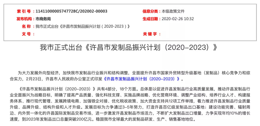 2020年2月23日,许昌市正式出台了《许昌市发制品振兴计划(2020-2023)》。