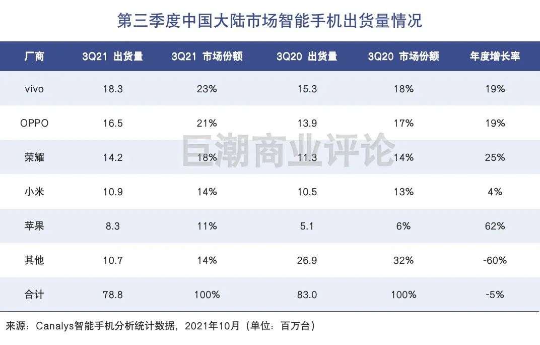 Canalys数据显示,中国大陆第三季度智能手机出货量前6的品牌中,小米手机的增速是最慢的,且第三的位置已经被荣耀所占领。从今年第二季度的9%市占率到第三季度的18%,荣耀的增长十分凶猛,对于对小米国内的出货量造成了明显的挤压。