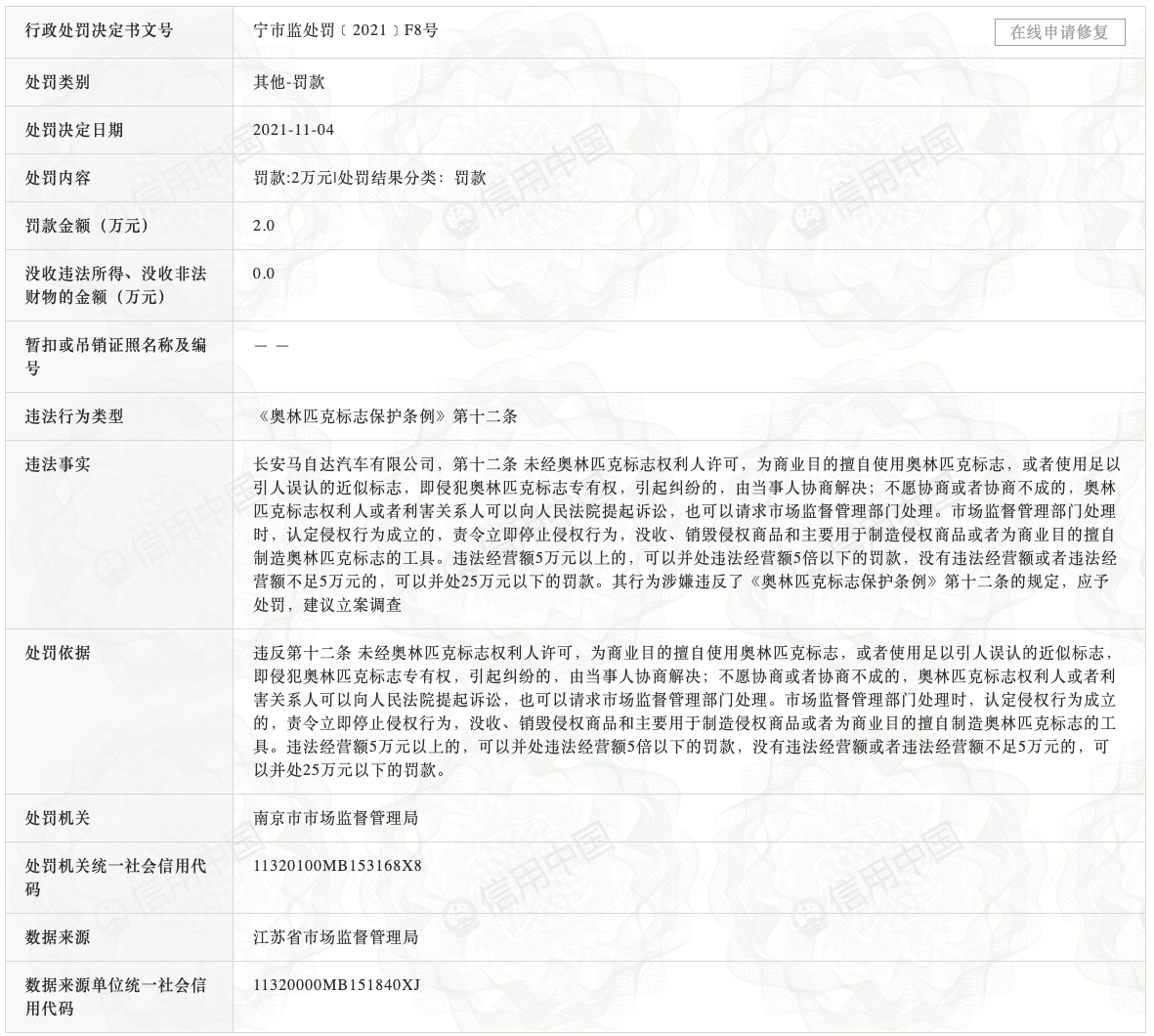 信用中国网站显示,11月4日,长安马自达汽车有限公司新增行政处罚,处罚事由为:未经许可,为商业目的擅自使用奥林匹克标志,或使用引人误认的近似标志。处罚结果为罚款2万元,处罚单位为南京市市场监督管理局。