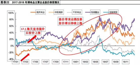 统计上述主要调味品16—18年间股价变动,在提价公布后短期内股价均处于上涨状态。