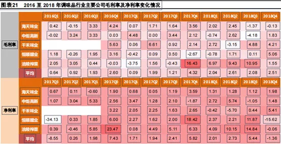 其中海天味业报表端改善显著,17年四季度毛利率同比增加3.56%,中炬高新四季度毛利率同比增加2.12%,千禾味业四季度毛利率同比增加2.14%,仅有恒顺醋业同比呈现下跌状态,真正好转体现在2018年。