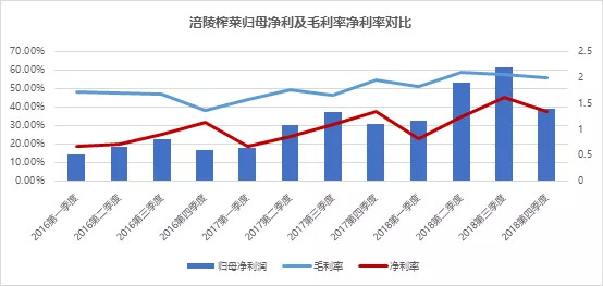涪陵榨菜的提价对毛利率和净利率贡献是巨大的。主要也体现在四季度上,毛利率同比增长16.43%,首次突破50%,达54.34%,创出阶段历史新高。