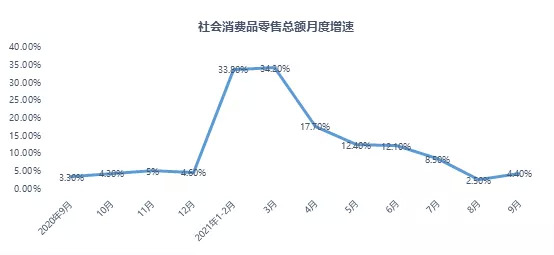 数据显示,今年我国第三季度GDP增速今为4.9%,低于预期。9月份,社会消费品零售总额36833亿元,同比增长4.4%。8月份增速更为惨淡,仅为2.5%,创近一年来新低。