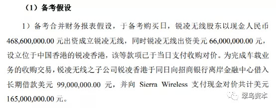 另据公告信息中的备考假设,锐凌香港向 Sierra Wireless 支付现金对价共计美元 1.65亿美元。