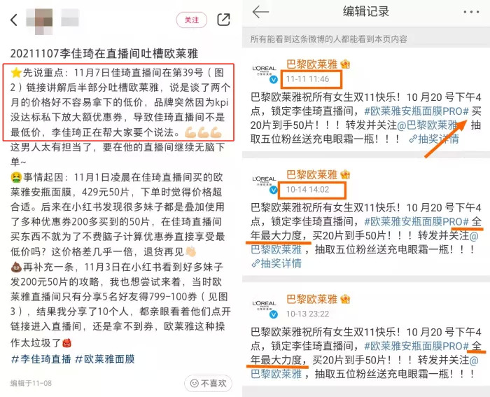 截图自小红书(左)、巴黎欧莱雅官方微博编辑记录截图(右)