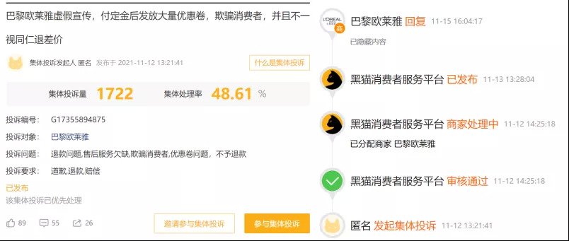 在投诉进度中可以看到,11月15日巴黎欧莱雅回复了投诉,开始大批处理差价问题。目前(11月16日下午4点35分),黑猫投诉平台上关于巴黎欧莱雅虚假宣传的投诉量为1722,处理率为48.61%。