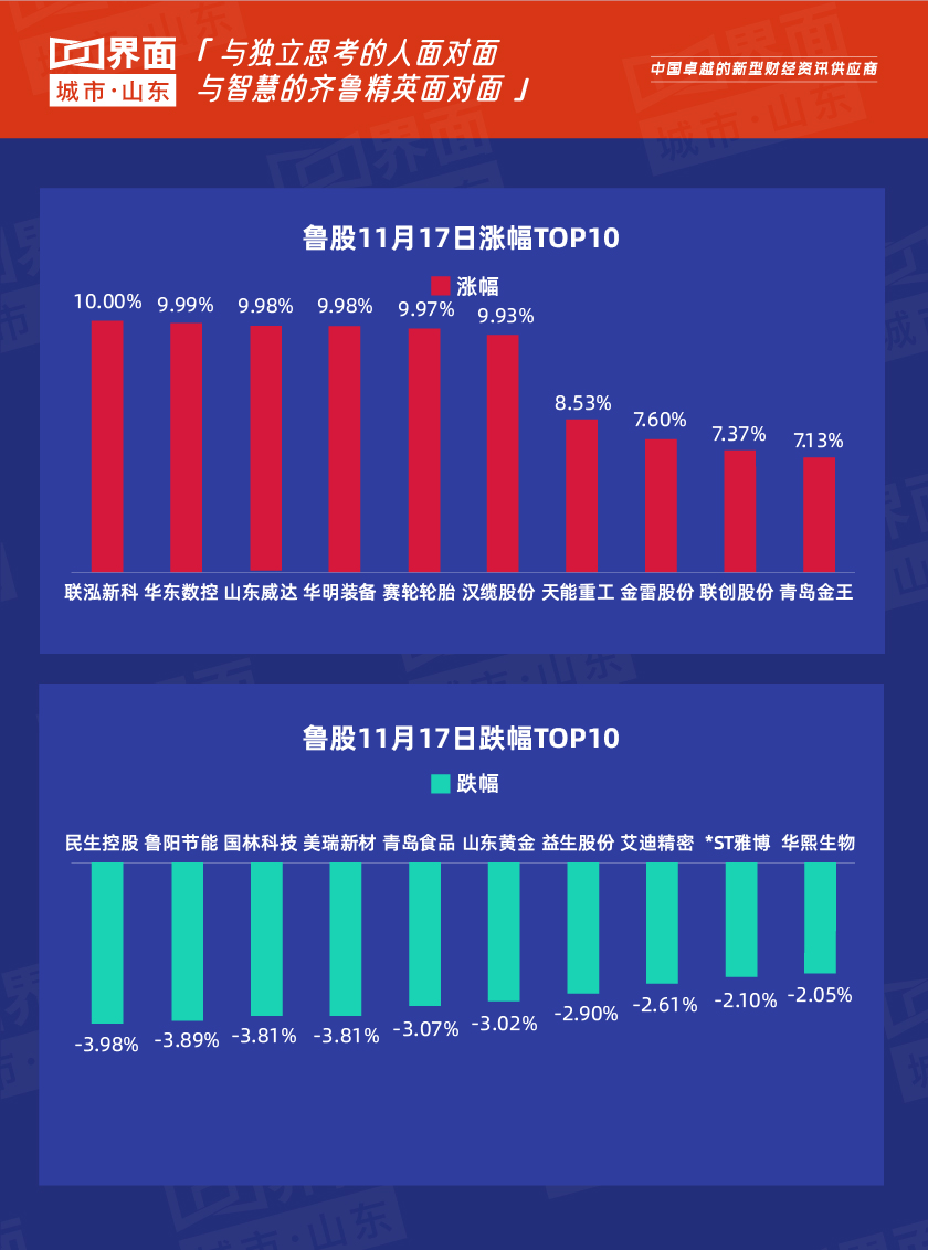 11月17日,山东省内沪深股票有190只个股上涨,53只个股下跌;总市值过千亿的有万华化学(600309)、海尔智家(600690)、歌尔股份(002241)、中航沈飞(600760)、青岛啤酒(600600)、兖州煤业(600188)、潍柴动力(000338)共7家,500亿-1000亿的共有6家,分别是联泓新科(003022)、华熙生物(688363)、山东黄金(600547)、华鲁恒升(600426)、中泰证券(600918)、玲珑轮胎(601966)。