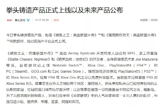 今日凌晨,拳头游戏在官方微博发表了一篇《拳头铸造产品正式上线以及未来产品公布》,其中拳头铸造首批产品,包括《破败之王》和《海克斯炸欢天》两款游戏,现已在海外平台正式上线。