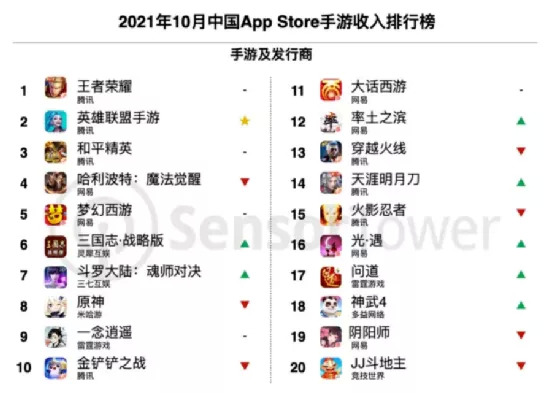 《英雄联盟手游》继承了《英雄联盟》的血统,让《英雄联盟》的经典玩法成功转移到了移动平台,从目前《英雄联盟手游》整体表现来看,截止2021年10月,该游戏海外收入预估在8000万美元左右,而国服开启不到一个月,仅iOS收入就超过了1亿美元。另外在Sensor Tower给出的10月中国iOS手游收入榜上,《英雄联盟手游》位列第2,超越《和平精英》成为又一款中国市场的头部大作。
