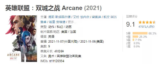 而动画剧集《英雄联盟:双城之战》上线即爆火,这部耗时6年的动画在豆瓣上获得了9.1的高分,《双城之战》以《英雄联盟》世界为背景,勾勒出了完整的世界观,该剧第一季动画总共九集,每集时间为40分钟,分三幕播出,三周内释放完毕,剧情主要聚焦金克丝和蔚这对姐妹的前传,讲述在符文之地上的双生城市中发生的热血故事。