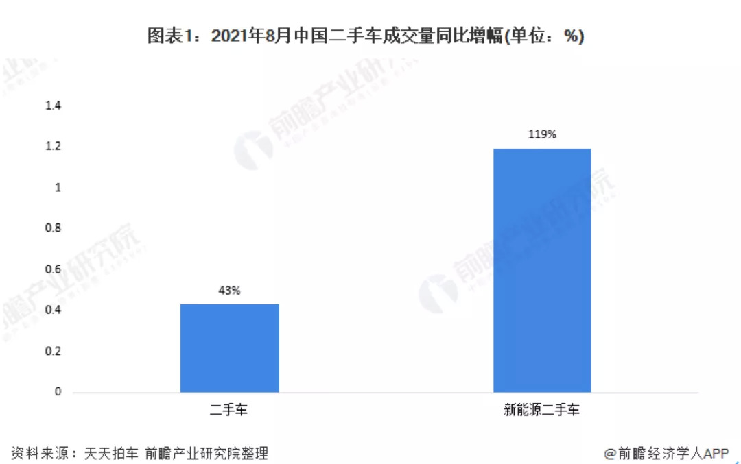 从整体行业的趋势来看,截至今年6月底,国内新能源汽车保有量已达603万辆。中国汽车流通协会预计,伴随着新能源汽车保有量的日益增长,国内新能源汽车二手市场或将迎来高增长阶段;第三方机构天天拍车公布的数据也显示,2020年新能源二手车成交量较之2019年实现了翻番增长;2021年8月,新能源二手车成交量同比增幅达到了119%。