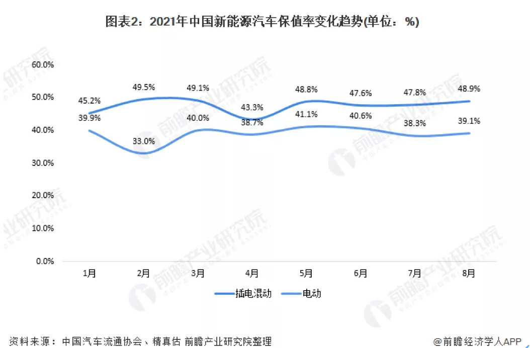 而来自于前瞻产业研究院的报告也显示,2021年1~8月,新能源汽车保值率趋于稳定,其中,插电混动汽车的保值率在在45-50%之间,而电动汽车的保值率基本在35%以上,保值率趋于稳定将有利于新能源二手车市场稳步发展。