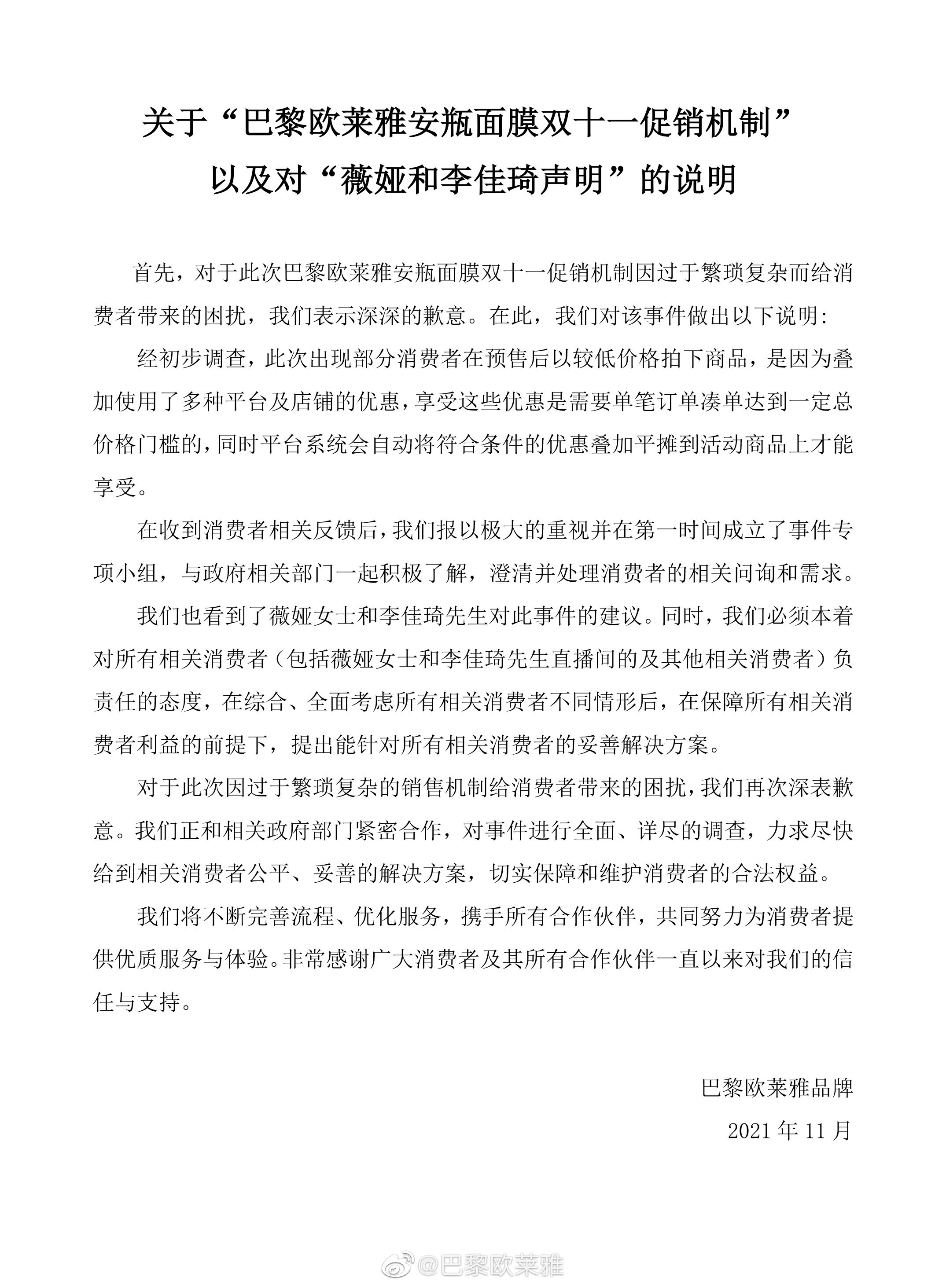 11月18日凌晨,@巴黎欧莱雅 就面膜事件发布致歉声明称,经初步调查,此次出现部分消费者在预售后以较低价格拍下商品,是因为叠加使用了多种平台及店铺的优惠。对于此次因过于繁琐复杂的销售机制给消费者带来的困扰,深表歉意。公司正和相关政府部门合作调查,将在保障所有相关消费者利益的前提下,提出能针对所有相关消费者的妥善解决方案。