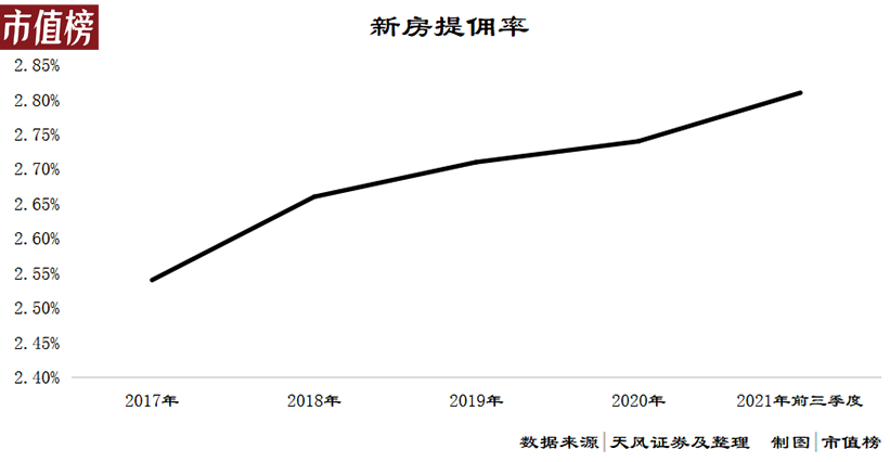 结果是,贝壳的新房提佣率从2017年的2.54%一路上扬,到了2021年前三个季度,综合的新房提佣率已经上升至2.81%。