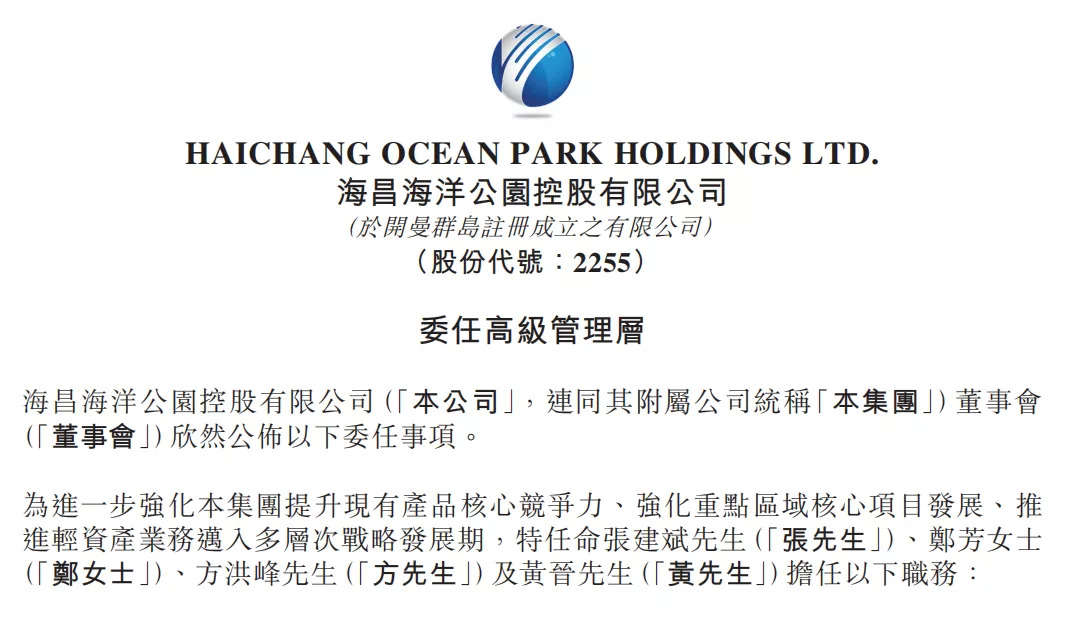 11月15日,海昌海洋公园发布公告,宣布了四位高管的最新任命。