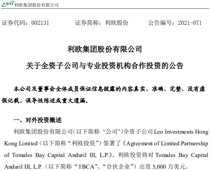11月16日晚间,利欧股份发布公告称,全资子公司Leo Investments HongKong Limited(下称“利欧投资”)签署了《Agreement of Limited Partnershipof Tomales Bay Capital Anduril III, L.P.》。而合伙企业的投资标的为Space Exploration Technologies Corp.,即大名鼎鼎的SpaceX。公告显示,全体合伙人的目标总认缴出资额约6亿美元,最高不超过7.5亿美元;普通合伙人为TBCA GP,利欧投资为有限合伙人,拟认购的出资额为5000万美元(约合人民币3.2亿元)。