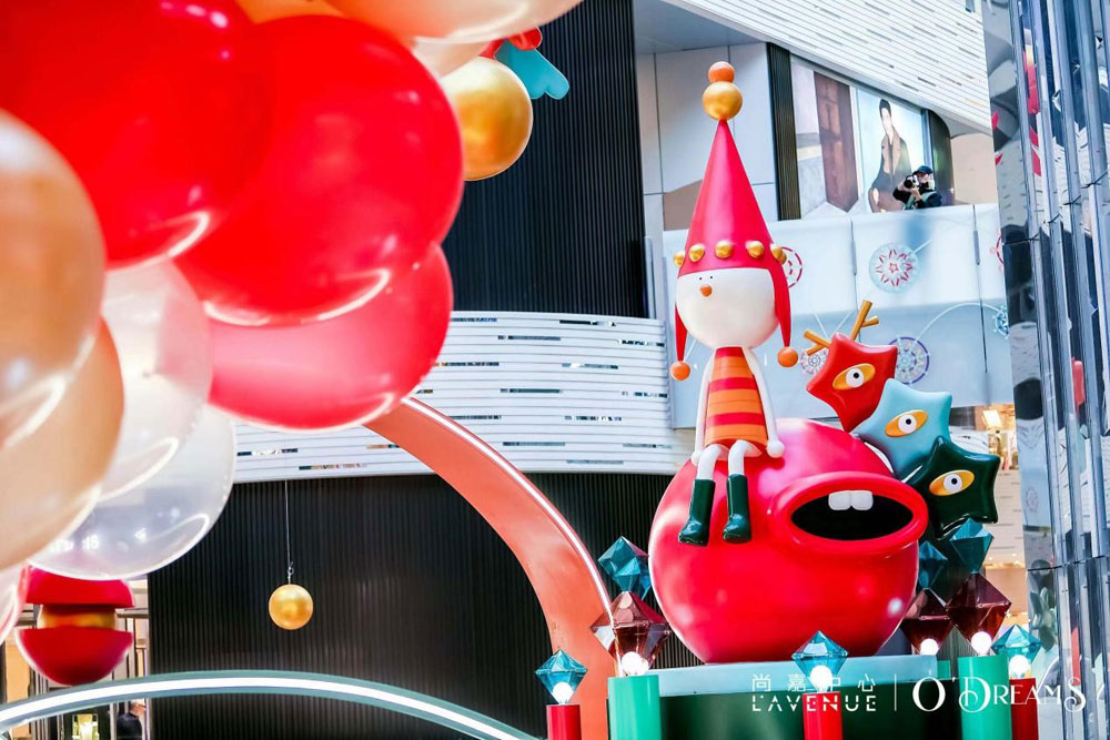 高达13米的「O'DREAMS圣诞礼物工坊」屹立于尚嘉中心LG1层中庭,镶嵌着收集心愿的魔幻天平、传输能量的魔法楼、配送礼物的圣诞麋鹿...圣诞精灵们穿梭其间,组成了一个温暖的童话世界。通过“魔法”将烟花凝固的圣诞礼盒、茶壶气泡幻化的笑脸、催熟裂开的苹果等元素完美搭配,呈现出工坊的灵动之感。头顶红色圣诞帽的的小女孩红XIXI掌控着工坊的全局,每当接收到心愿时,整个工坊便跟着热闹起来,等待着到访者一起探秘与发现。