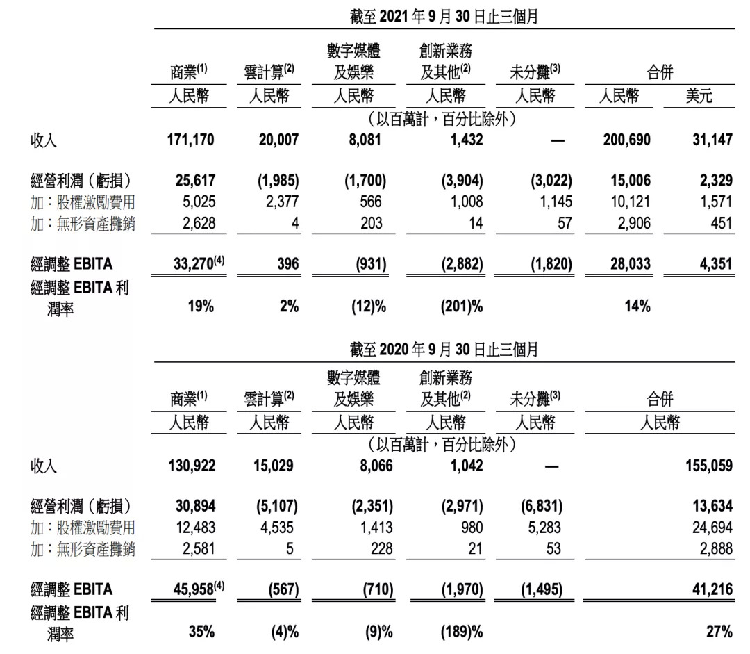 根据财报,阿里巴巴三季度经调整EBITA为280亿,同比下降32%;经调整EBITA利润率为14%,较去年同期的27%下滑明显。除了连续第四个季度实现盈利的阿里云,其他各经营分部的经调整EBITA利润率均呈现下滑态势。其中,“商业”分部的经调整EBITA利润率从去年同期的35%降至19%。