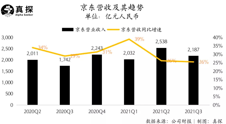 根据财报,京东三季度总营收为2187亿(若无说明,单位均为人民币),同比增长25.5%,超过市场预估的2156.1亿元;