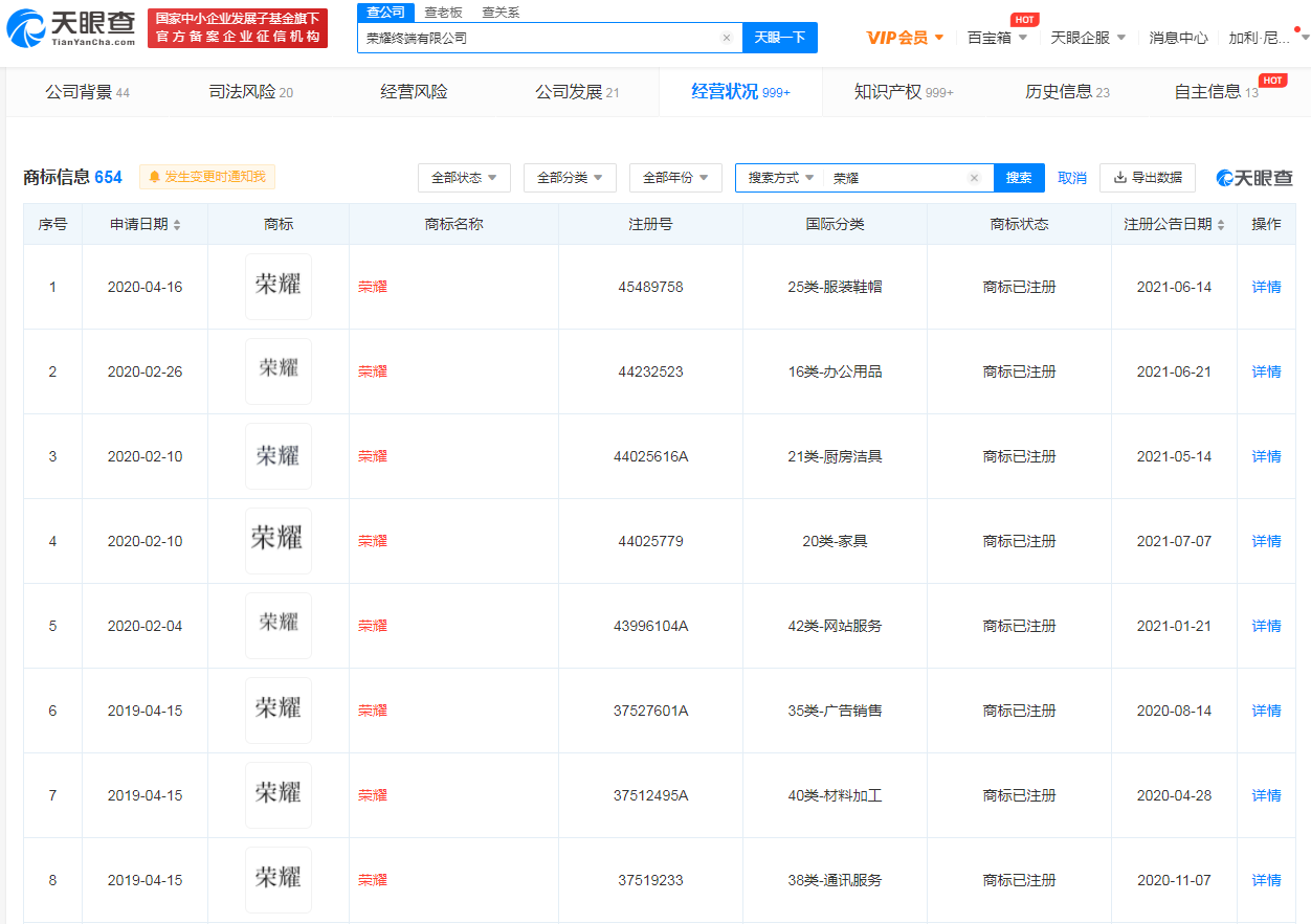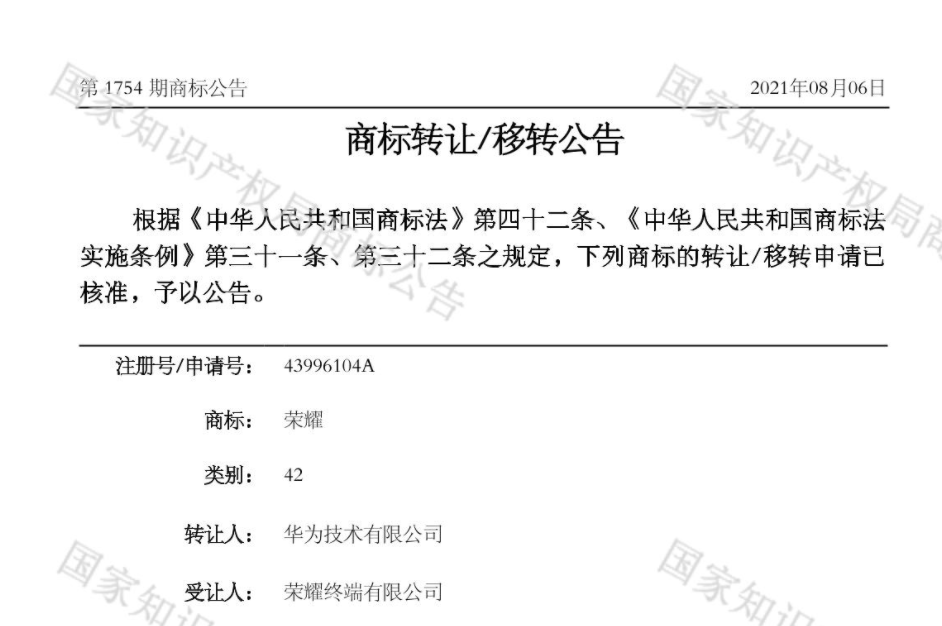天眼查App显示,近期,荣耀终端有限公司获得华为技术有限公司批量商标转让,涉及“荣耀”“HONOR”“荣耀潮玩”等多个商标,国际分类包括广告销售、通讯服务、网站服务等。