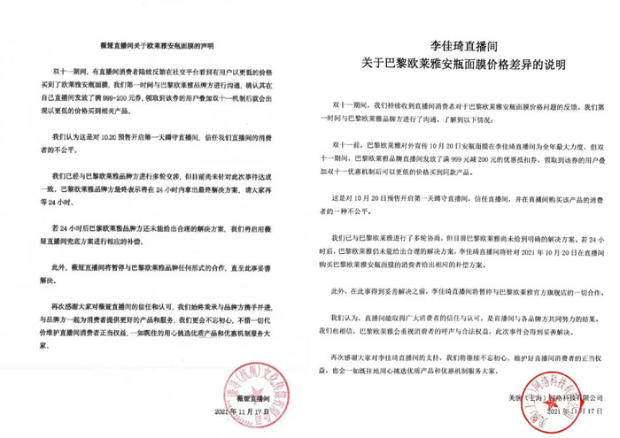 昨天(11月17日)晚上8点左右,针对欧莱雅安瓶面膜差价问题,李佳琦和薇娅纷纷在微博平台发布说明,称“已经与品牌方进行多轮交涉,但目前尚未针对此事件达成一致,若品牌方24小时候后还未能给出合理的解决方案,直播间将给予补偿方案”,并表四“目前,已暂停与欧莱雅方的合作”。