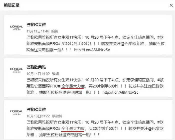 有网友指出,欧莱雅官方微博曾在10月13日发布微博称李佳琦直播间的优惠为“全年最大力度”,但是在事发后11月11日下午14点16分又将原文中的“全年最大力度”字眼去掉,如今,这条微博已被删除。