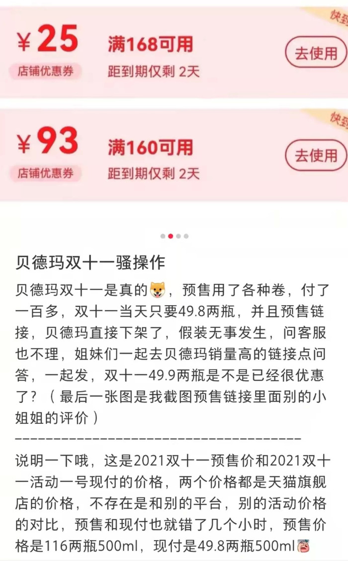 此外,现货价格比直播间预售价格便宜的现象也并非只发生在欧莱雅店铺,有网友指出,她在李佳琦直播间花了116买到了两瓶贝德玛卸妆水,然而品牌私自放券只需要49.8就能买到两瓶卸妆水,差价有一倍之多。类似的例子不胜枚举。