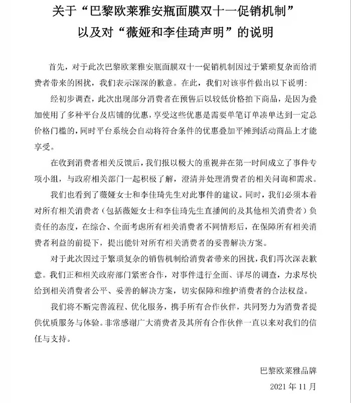 文中,欧莱雅表示“对于此次巴黎欧莱雅安瓶面膜双十一促销机制过于繁琐复杂而给消费者带来的困扰表示深深的歉意”,随后解释了257元的低价是由于“叠加了多平台及店铺的优惠”,并且“享受这些优惠需要单笔订单凑单达到一定总价格门槛”,最后表示品牌方对消费者的反馈“报以极大的重视并在第一时间成立了事件专项小组”,未来将“在保障所有相关消费者利益的前提下,提出能针对所有消费者的妥善解决方案”。