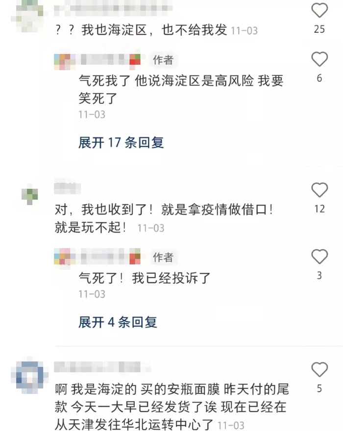 虽然是否“虚假发货”有待商榷,但欧莱雅延迟发货已被网友实锤。一名小红书博主十一月三号发笔记称,购买页面上显示三号前发货,但是欧莱雅却表示北京海淀区是高风险地区,不能发货,而底下一名网友评论称,自己也是海淀区的,二号付的尾款三号一大早就发货了。按理来说,双十一期间订单量大,库存不足是正常状况,摆事实、讲道理或许能获得消费者的谅解,但欧莱雅借疫情之名延迟发货的行为实在令人不解。