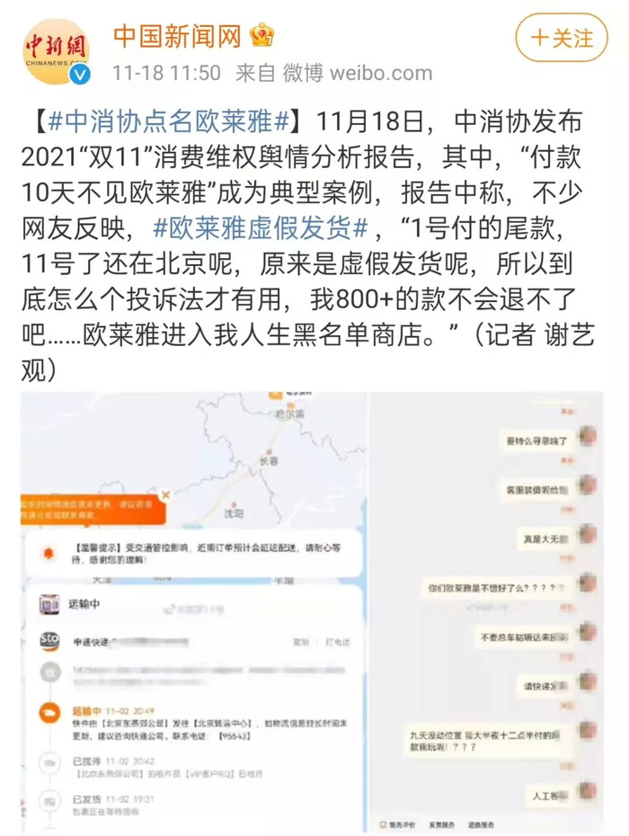近日,中消协点名批评欧莱雅“虚假发货”,称“付款10天不见欧莱雅”成典型案例。