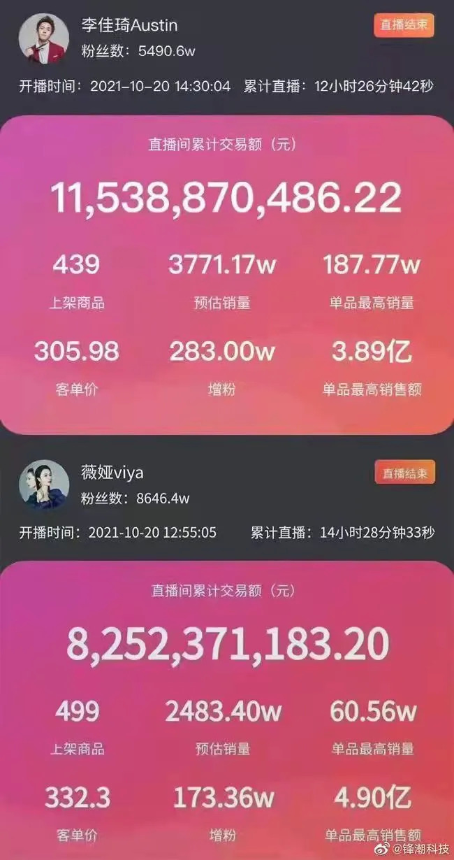 近几年来随着消费习惯和消费渠道的变更,直播的火热程度有目共睹。双十一预售第一天(10月20日),仅凭李佳琦、薇娅两人就卖出了200多亿元,其中李佳琦卖了115亿元,薇娅卖了85亿元,而排名第三的主播仅卖出了不到10亿,头部“垄断”效应体现得淋漓尽致。
