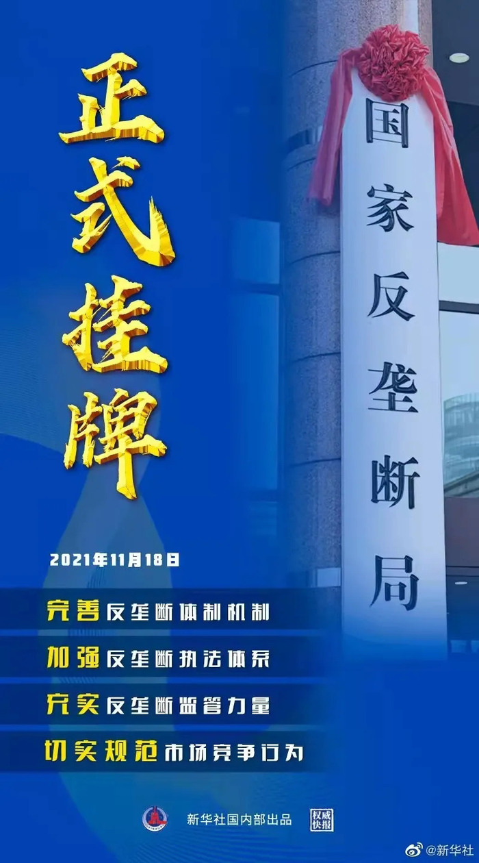 值得注意的是,今天(11月18日),在国家市场监督管理总局办公大楼,国家反垄断局正式挂牌,表示要“完善反垄断体制机制、加强反垄断执法体系、充实反垄断 监管力量、切实规范市场竞争行为”。