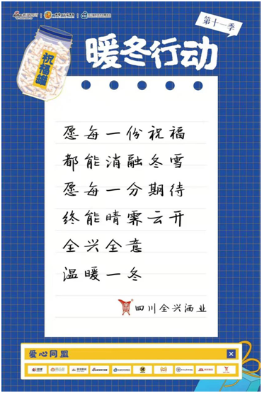 “心向暖阳,不畏寒冬”。此次暖冬行动是四川新浪首发,正能量艺人杨幂、贾乃亮作为活动爱心大使,在微博上发起“满满祝福罐”公益号召,全兴酒业作为活动主办方的特邀爱心企业再次响应号召,邀请企业粉丝留下祝福,让山区儿童感受到漫漫冬日温暖。