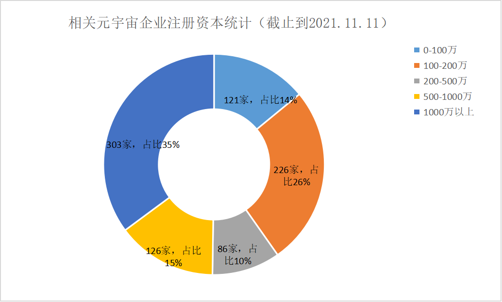 根据相关检索,目前在与元宇宙相关的企业中,不同注册资本的企业分布相对比较均匀。不过注册资本超1000万的企业仍然呈现了明显的数量优势,在所有企业中数量超300家,占比35%。