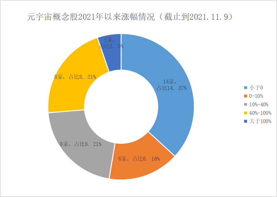 目前A股市场上有元宇宙概念股企业38家,2021年以来,仅有14家的股价增长为负,占比37%,其余都保持上涨态势。其中,股价超4成的企业股价上涨超40%。