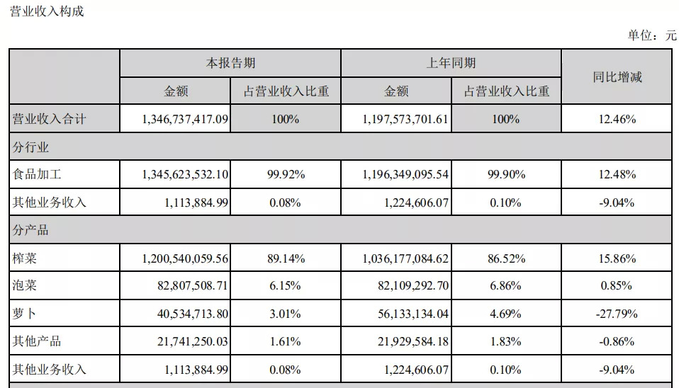 今年的半年报显示,涪陵榨菜13.47亿元的营收中,榨菜贡献了12亿元营收,占比89.14%。