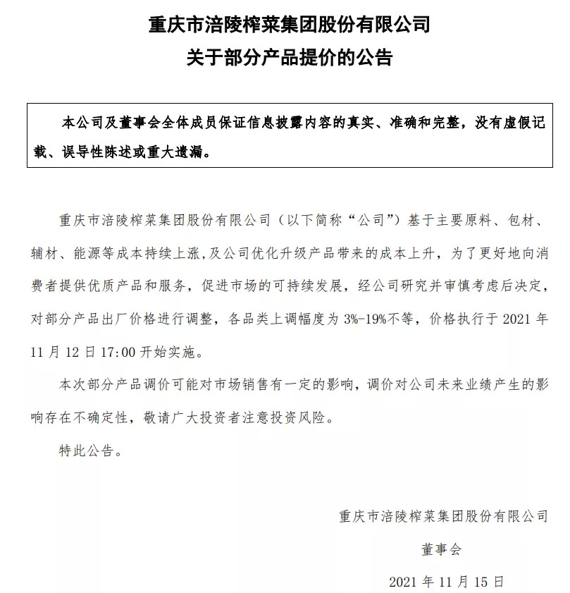 11月15日,重庆涪陵榨菜集团股份有限公司发布提价公告: