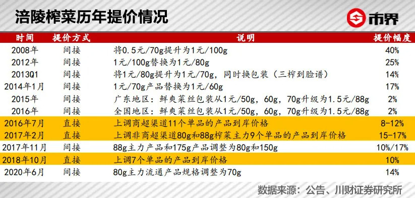 其中,最近一次的提价为间接提价——2020年6月,涪陵榨菜将80克主力流通产品的规格降低为70克。
