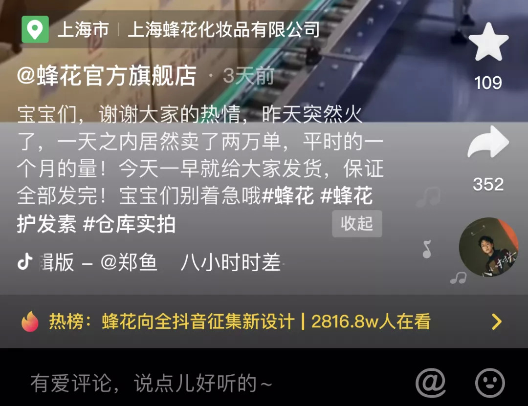 据蜂花抖音官方表示,因为网友的“热心支持”,一天之内卖了两万单,相当于平时一个月的量。