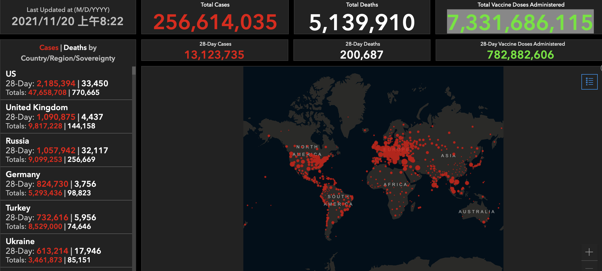 据约翰·霍普金斯大学的疫情追踪数据,截至北京时间11月20日上午9点,全球累计确诊新冠肺炎病例256614035例,累计死亡5139910例,接种疫苗超7331686115剂次。